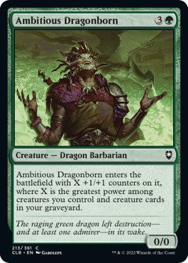 - Rules Text Contains: Ambitious Dragonborn enters the battlefield with X +1/+1 counters on it, where X is the greatest power among creatures you control and creature cards in your graveyard.